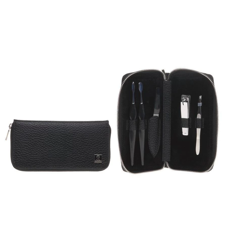 5-delige manicure set in zwart leder, inhoud: carbon staal pincet, nagelvijl 9,5 cm, RVS nagelknipper en 2 nagel instrumenten.