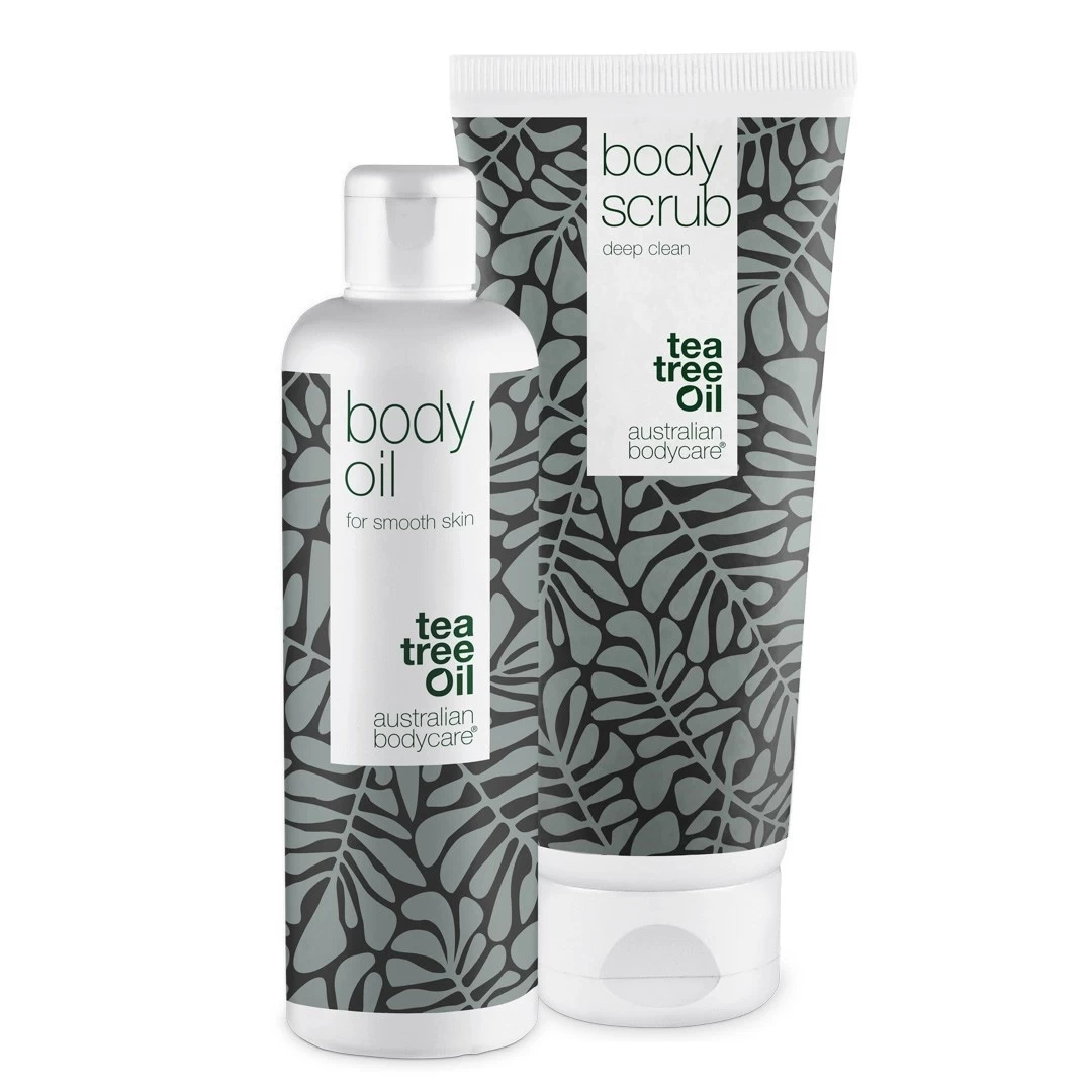 De set bestaat uit Body Scrub en Body Oil voor het exfoliëren en verzorgen van de huid op het lichaam. De producten voegen vocht toe aan de huid, waardoor de zichtbaarheid van sinaasappelhuid en andere oneffenheden wordt verminderd. Voor een mooie, gladde en egale huid is het belangrijk om regelmatig dode huidcellen te laten verwijderen. Wanneer je een paar keer per week een exfoliërende bodyscrub gebruikt, ziet je huid er glad en schoon uit en zorg je er tegelijkertijd voor dat deze de actieve ingrediënten uit de lichaamsolie beter kan opnemen. Body Scrub is gebaseerd op Australische Tea Tree Olie en geplette abrikozenpitten, die de huid gezond, schoon en mooi houden. De zichtbaarheid van cellulitis, striae of littekens kan verminderd worden, door te zorgen voor een gehydrateerde en soepele huid. Een lichaamsolie op basis van hydraterende en voedende ingrediënten is daarom belangrijk. De lichaamsolie in de verpakking is op basis van zowel Squalaan, Amandelolie als Zonnebloemolie, wat zorgt voor vocht, bescherming en draagt bij met een hoog gehalte aan vitamine E. De producten in het pakket kunnen over het hele lichaam worden gebruikt waar je een gladdere en meer uniforme huid wilt. De producten zijn dermatologisch getest en kunnen door alle huidtypes en door zwangere vrouwen en vrouwen die borstvoeding geven worden gebruikt.