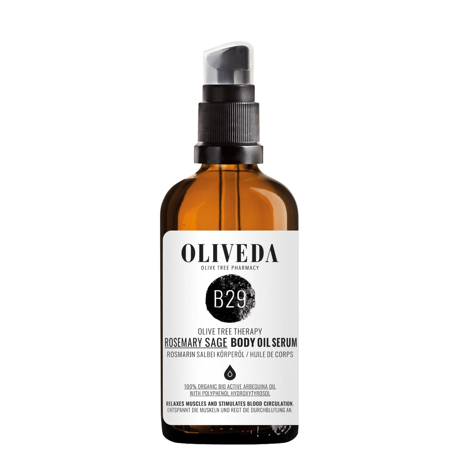 De 100% biologische lichaamsolie is de perfecte vochtinbrenger en voedseldonor en wordt door haar ragfijne textuur volledig in de huid opgenomen. De zeer effectieve, meermaals bekroonde Arbequina Extra Vergine Olijfolie en het verse Olijfbladcellenelixer dempen, maken de huid glad en zorgen voor een fluweelzachte en stevige huid. Terwijl salie de spieren ontspant, stimuleert rozemarijn de bloedsomloop en brengt het lichaam weer in beweging. Perfect na het sporten! Dagelijks ’s morgens en ’s avonds goed inmasseren.