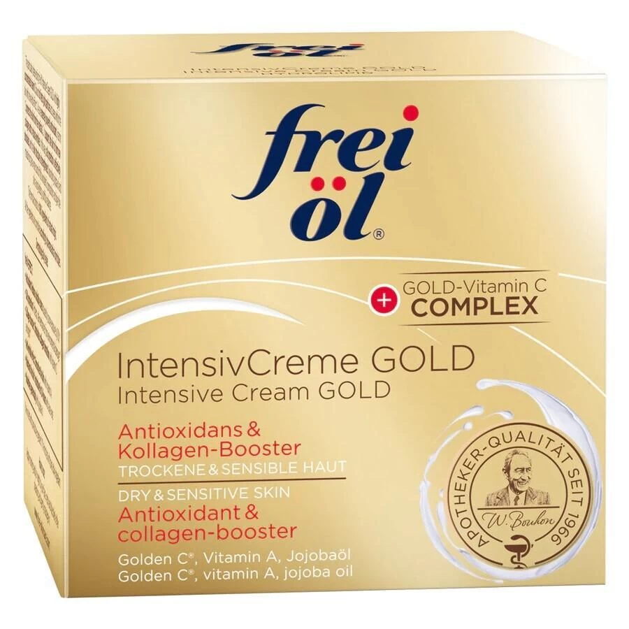 De bijzonder diep in de huid werkzame frei öl® Intensive Creme Gold met sterk geconcentreerde vitamine C gebonden aan zeer fijne gouddeeltjes werkt meteen dubbel en tot diep in de huid.