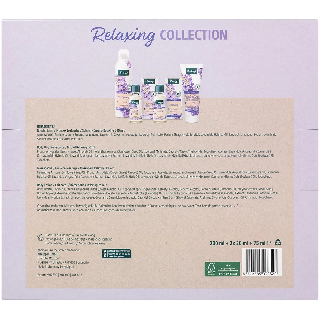 Geniet van een moment van pure ontspanning met de Kneipp® Relaxing Collection producten. Geniet van een moment van pure ontspanning. Deze geschenkset bevat een Relaxing douche foam 200ml, Relaxing body lotion 75 ml, Relaxing huidolie 20ml en een Relaxing massageolie 20ml.