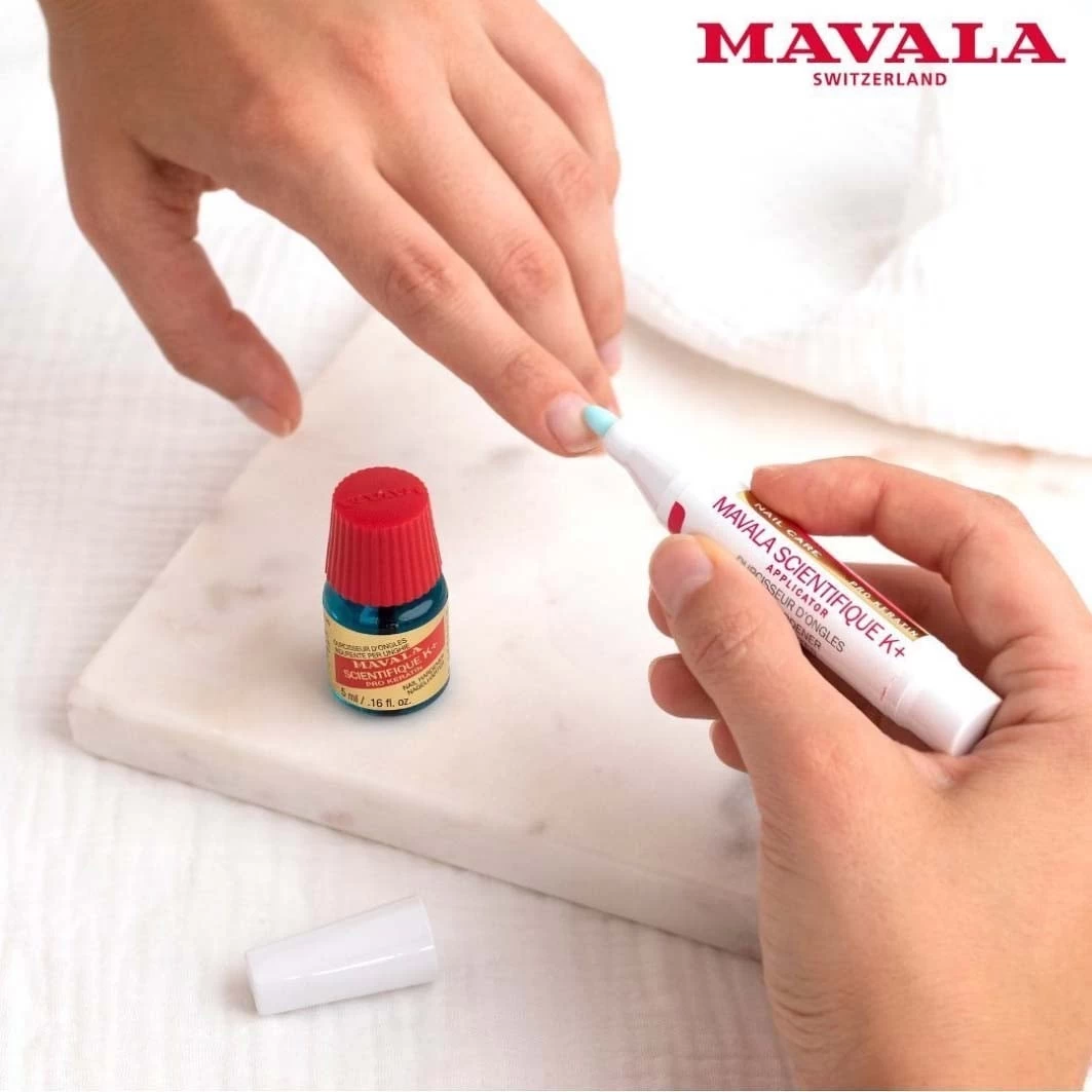 Ervaring heeft bewezen dat de top van de nagel het meest kwetsbare gedeelte is dat gemakkelijk breekt, dus daardoor versterkt moet worden. De Mavala Scientifique K+ verhardt de nagelplaat dankzij een wetenschappelijk actief ingrediënt dat de samenhang van keratinevezels verbetert zodat de drie belangrijkste nagellagen met elkaar worden verbonden. Het product bevat ook kristallen harsdruppels van de pistache mastiekboom, die voor komt op het Griekse eiland Chios. Dit gom extract helpt bij het natuurlijke verhoorningsproces van de nagels, het versterkt ze. Deze indringende waterige oplossing verhardt zachte nagels en voorkomt breken of splijten. Als toevoeging op dit product heeft Mavala eenzelfde product ontwikkeld waarbij de FORMALDEHYDE vervangen is door ingrediënten die dezelfde werking hebben. Dit alles voor een nog betere gezondheid van de nagels.