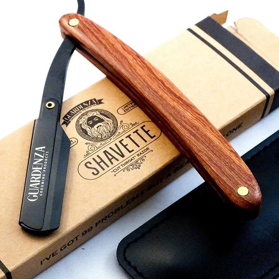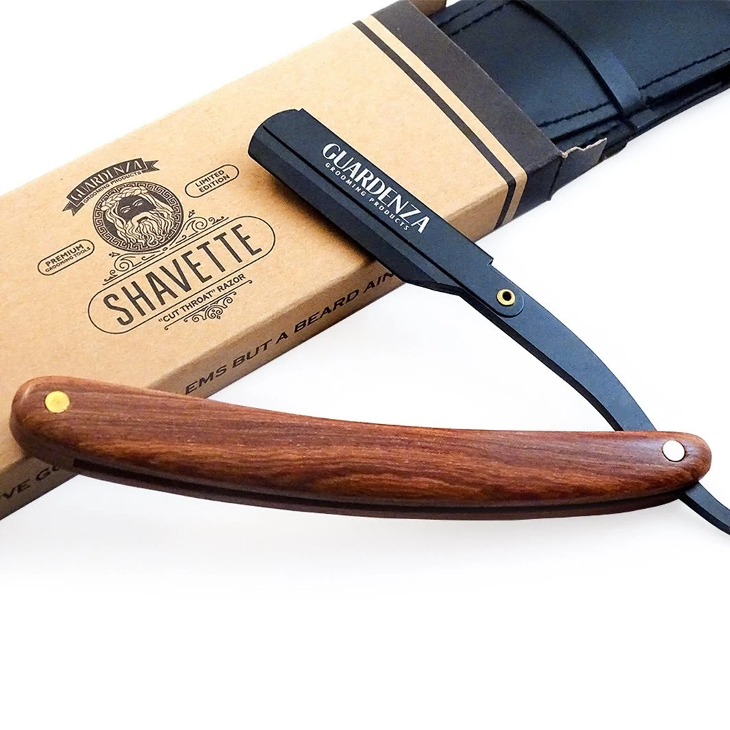 - Top kwaliteit en ontwerp: Onze Guardenza Shavette “Cut Throat” scheermes is gemaakt van zwart-gecoat roestvrij staal, gepaard met een authentiek houten handvat om een stevige comfortabele grip te geven. Dit is het ideale scheermes dat gemak, authenticiteit en scherpte combineert als geen ander.