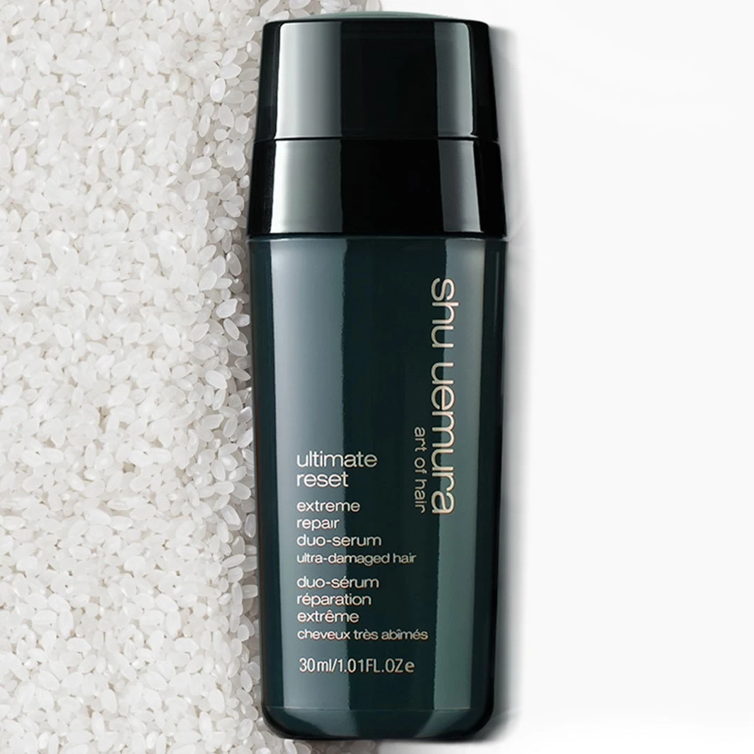 Shu Uemura Art of Hair Ultimate Reset Extreme Repair Double Serum is een herstellend duo-serum voor zeer beschadigd haar. De extreem sterke dubbele formule is verrijkt met Japans rijstextract en herstelt schade die is veroorzaakt door veelvuldig bleken, kleuren, permanenten en stylen met warmte. Het duo-serum combineert twee bekroonde technologieën. CSP 50-olie verzorgt het haar intensief terwijl het licht en zacht blijft, zonder vettige residue achter te laten. De SRS-technologie wordt geactiveerd door warmte, voor een optimale styling met warmtestylingtools.