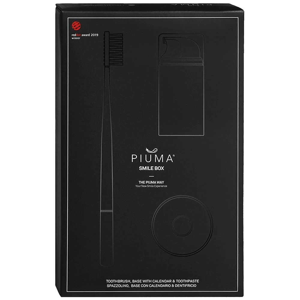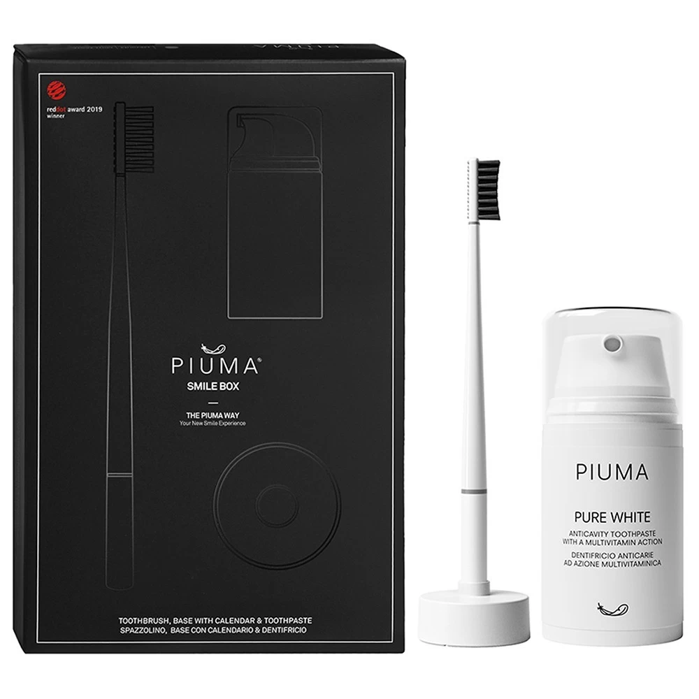 Deze set bevat een Piuma tandenborstel, een speciale houder waar u de tandenborstel in kan plaatsen en tandpasta.