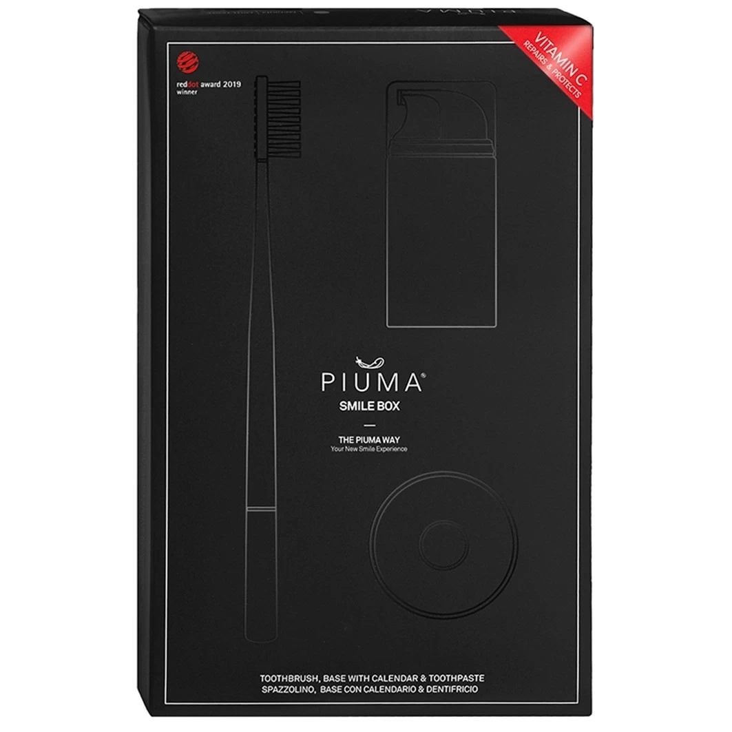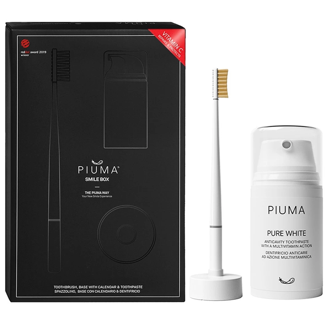 Deze set bevat een Piuma Vitamine C tandenborstel, een speciale houder waar je de tandenborstel in kan plaatsen en tandpasta.